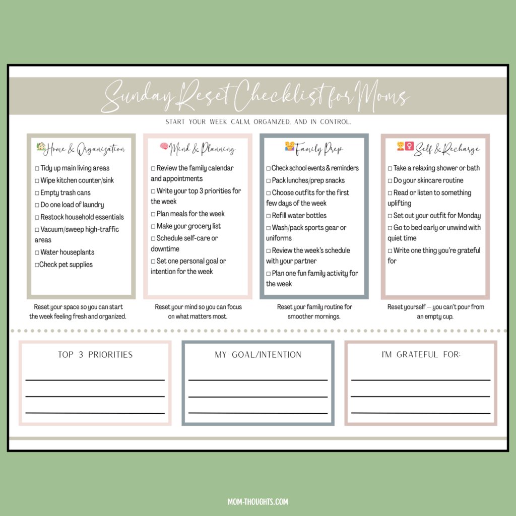 If you’re ready to make your own routine easier to follow, grab this printable Sunday Reset Checklist for Moms. It breaks everything down into simple, doable steps so you can spend less time figuring out what to do and more time feeling confident and in control when Monday rolls around.